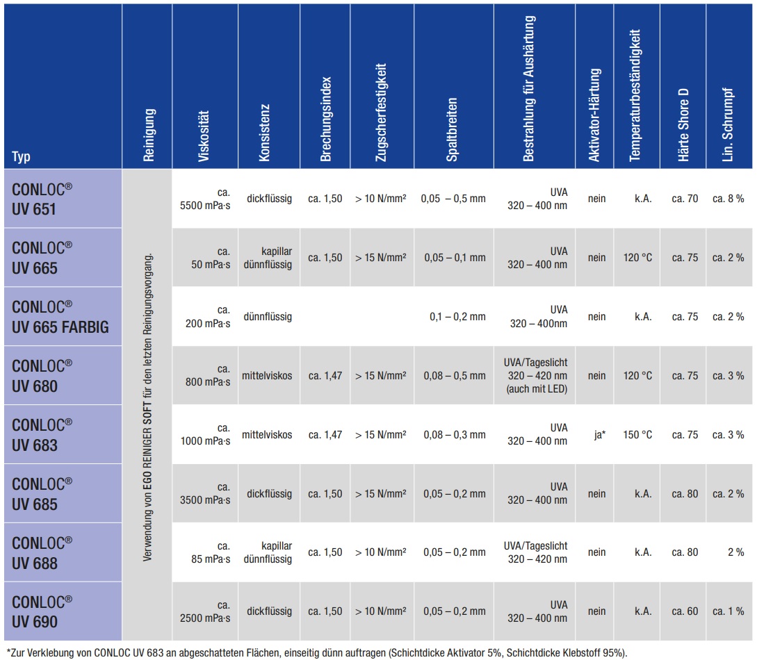 CONLOC UV 685 je srednje viskozno enokomponentno UV lepilo, katero se strjuje z izpostavljenostjo UV svetlobi.