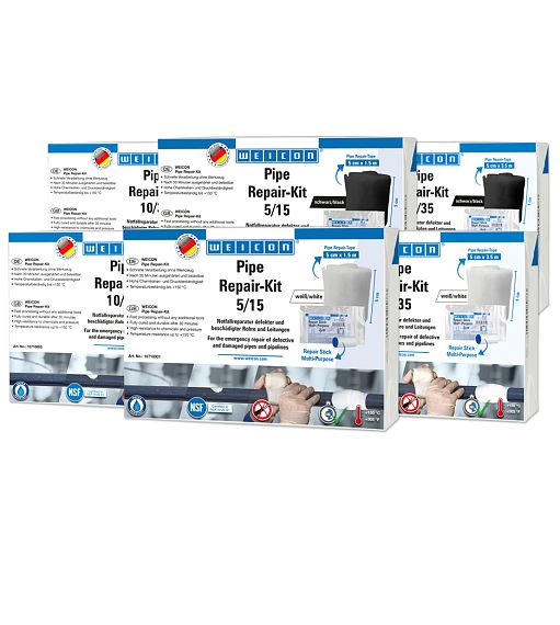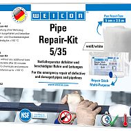 Set je idealen za nujno popravilo okvarjenih in poškodovanih cevi in cevovodov. Vsebuje eno WEICON epoksi palico za popravila, poseben popravljalni trak iz plastike, ojačane s steklenimi vlakni, navodila za uporabo in par zaščitnih rokavic. Reparaturni trak je prepojen s posebno smolo in se ob stiku z vodo aktivira. Komplet za popravilo cevi je mogoče obdelati brez dodatnega orodja in zagotavlja zanesljivo dolgotrajno tesnjenje razpok in puščanj. Nanaša se zelo enostavno in hitro ter ima odlične lepilne lastnosti, visoko odpornost na pritisk in kemikalije ter visoko temperaturno obstojnost do 150°C. V 30 minutah je trak popolnoma strjen in trpežen. Zaradi lastnosti tkanine traku, posledične visoke fleksibilnosti in enostavne uporabe je Repair-Kit še posebej primeren za uporabo na krivinah cevi, T-kosih ali težko dostopnih območjih. Uporablja se lahko na številnih različnih površinah, kot so nerjavno jeklo (inox), aluminij, baker, PVC, številne plastike, steklena vlakna, beton, keramika in guma.