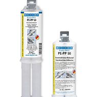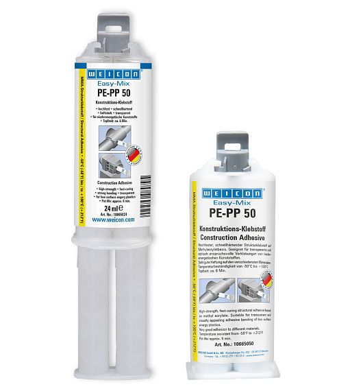 WEICON Easy-Mix PE-PP 50 je 2-komponentno konstrukcijsko lepilo na osnovi metil akrilata. Zaradi transparentnega utrjevanja je še posebej primeren za vizualno privlačno lepljenje z visoko trdnostjo plastike z nizko površinsko energijo, kot so PE, PP in TPE. Zahvaljujoč posebni formuli je lepilo primerno za “zero-gap” lepljenje in za spajanje površin z izjemno majhnimi lepilnimi režami, manjšimi od 0,2 mm. Strukturno lepilo ima hitro nastajanje trdnosti in visoko končno trdnost. Je odporen na udarce, odporen na staranje, odporen na kemikalije in rahlo tiksotropen. PE-PP 50 ima kratek čas strjevanje 6 minut in čas obdelave 12 minut. Nanaša se po sistemu 1:1 in ne zahteva predpriprave lepilnih površin, saj ima lepilo integriran temeljni premaz.