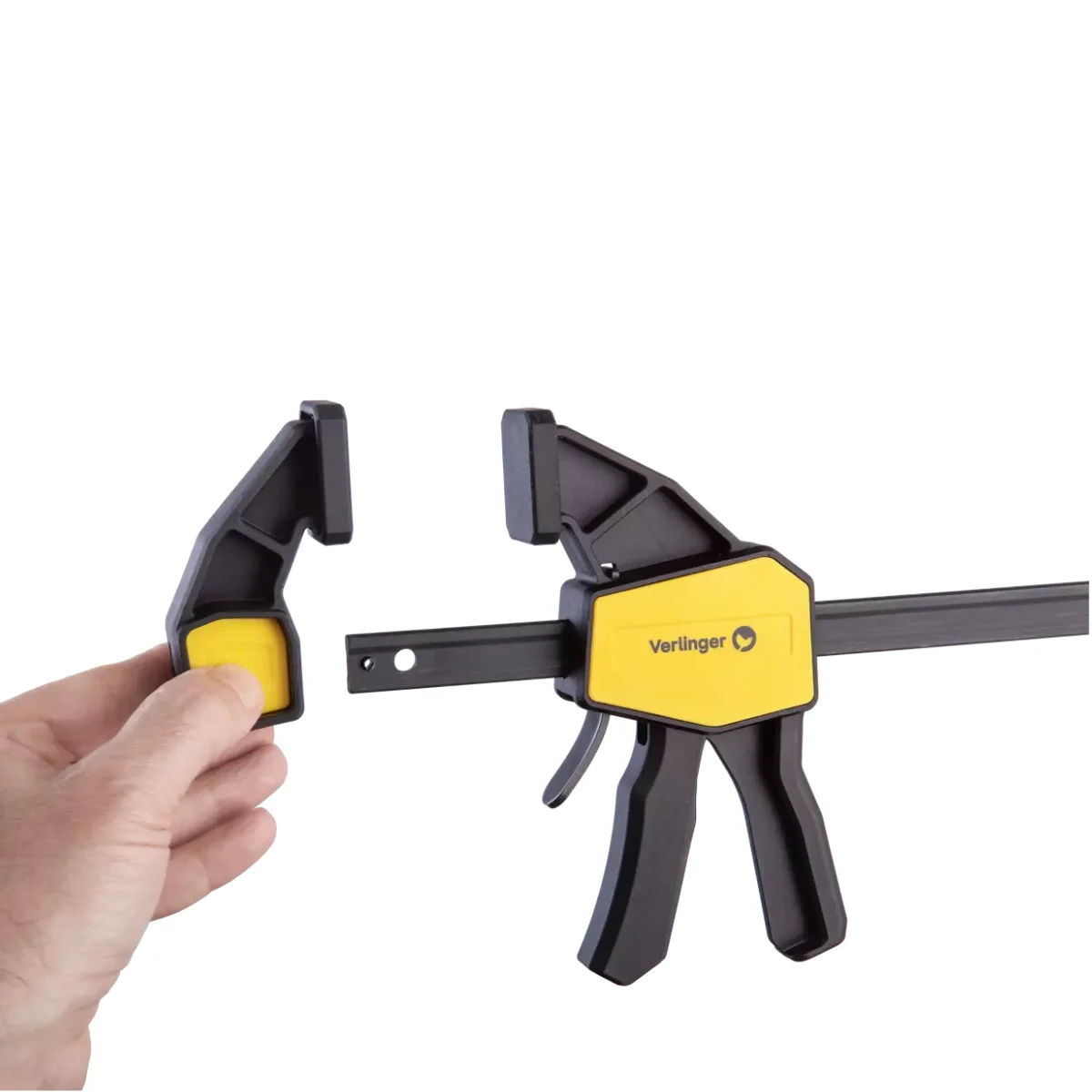 Opremljene so z nedrsečimi gumijastimi blazinicami, ki ščitijo material pred poškodbami, preprečujejo zdrs ter zagotavljajo enakomeren pritisk na površino. Model vključuje premično čeljust z nastavljivim ročajem za enostavno prilagoditev v vseh smereh ter snemljivo čeljust z gumbom, ki omogoča hitro preklapljanje med vpenjanjem in razpiranjem.