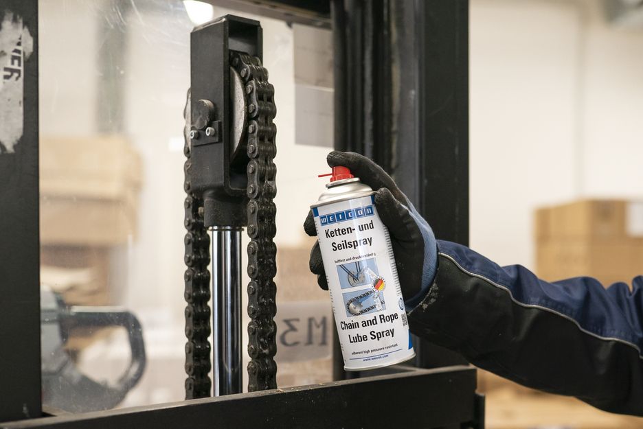 Weicon RAZPRŠILEC ZA VERIGE IN PLETENICE je sintetično prozorno mazivo za zunanje in notranje podmazovanje visoko obremenjenih verig in žičnih vrvi vseh vrst. Odporen je na temperaturo od -40°C do +200°C in ima izjemne lastnosti oprijemanja, odpornost na pritisk in vodo odbojnost.