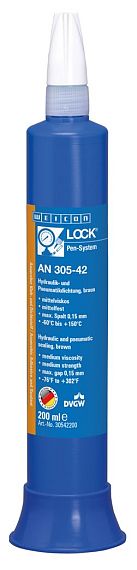 Hidravlično in pnevmatsko tesnilo Weicon WEICONLOCK® AN 305-42 s certifikatom DVGW. Je srednje viskoznosti, srednje trdnosti, za normalno odvijačenje.